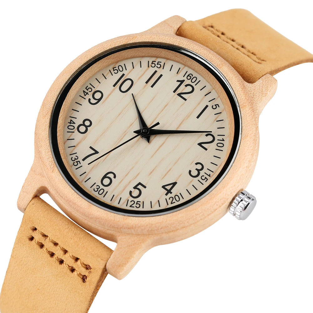 TOP Simple Pure Maple Wood Women's Watch Timepiece Digital Display Genuine Leather Quartz Wristwatch Ex